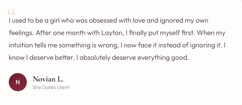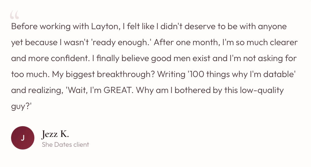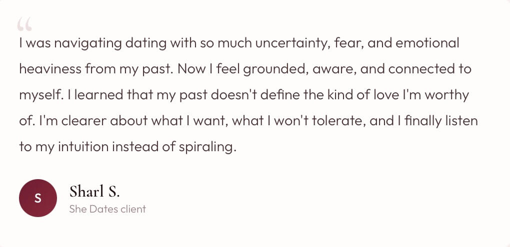 She Dates helps you break toxic dating patterns, build unshakeable standards, and finally trust yourself enough to walk away from what's not right, so you can attract a man who's actually ready for you. No games. No manifesting. Just real clarity, real confidence, and real transformation.